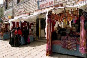 Over time side streets, lanes and alleys were added and the Barkhor Square. Today the pilgrims are still circumambulating the temple and the surrounding area has become a major tourist destination. This is the best place to see Lhasa's traditional Tibetan architecture and the streets are lined by small shops selling Tibetan souvenirs such as prayer wheels, the tradition Tibetan long-sleeve 'chuba', Tibetan knives, jade jewellery, Buddhist statues and other religious artefacts. It is also the place to find 'Thangka' or Tibetan scroll paintings with themes of religion, history, literature, etc.